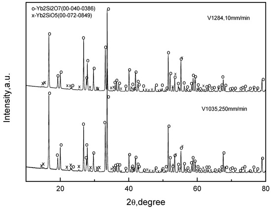 Consider first, the fibers were crystallized from the Yb2O3–SiO2 mixture corresponding to Yb2Si2O7. The microstructures of the fibers crystallized at the rates of 10 and 250 mm/min are presented in Figure 3 and Figure 4, respectively. The crystallization started from the top of the oxide/molybdenum block and proceeded towards its bottom. Therefore, the microstructures of the fibers at the top and bottom of the specimens are shown. It can be seen that the fibers were non-homogeneous; they contained inclusions of monosilicate: the results of X-ray microanalysis presented in these figures revealed it as the “white” phase on the micrographs. The same result was obtained by the X-ray phase analysis presented in Figure 5. There was no noticeable difference in the microstructure of the fibers obtained at the crystallization rates 10 and 250 mm/min. Qualitatively, the fibers from both the top and bottom of the specimens had similar microstructures.