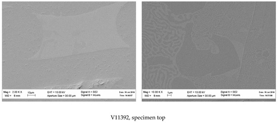 The attempts to crystallize Y2O3–Y2SiO5 eutectic fibers also gave interesting results. X-ray analysis of the fibers crystallized from the raw oxide mixture G0046 revealed the presence of both Y2O3 cubic (la-3) and monoclinic Yb2SiO5 (l2/a(15)) phases (Figure 8). At the same time, additional peaks d = 2.833 Å, d = 2.7553 Å and d = 1.776 Å can be seen, which do not correspond to any known phases. The SEM micrographs of the fibers presented in Figure 9 show typical eutectic microstructures and ytterbia inclusions, which can also be a result of silica depletion in the melt.