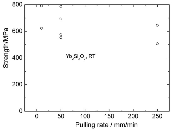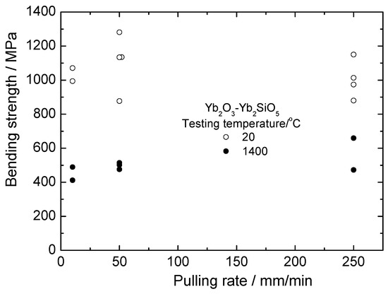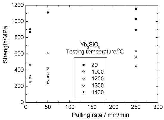 The room and high temperature strength of Yb2O3 –Yb2SiO5 fibers is presented in Figure 13. First, it can be seen that the strength of these fibers is noticeably higher than that of silicate fibers. Secondly, there is no essential dependence of the fiber strength on crystallization rate. This can be explained (i) by the absence of usual dependence of a characteristic size of the eutectic microstructure on crystallization rate and (ii) by the presence of large inclusions of ytterbia in the fibers, as can be seen in Figure 9. Mechanical properties of yttrebia crystallized from the melt are unknown. The results obtained allow assuming the strength characteristics of such material to be sufficiently high.