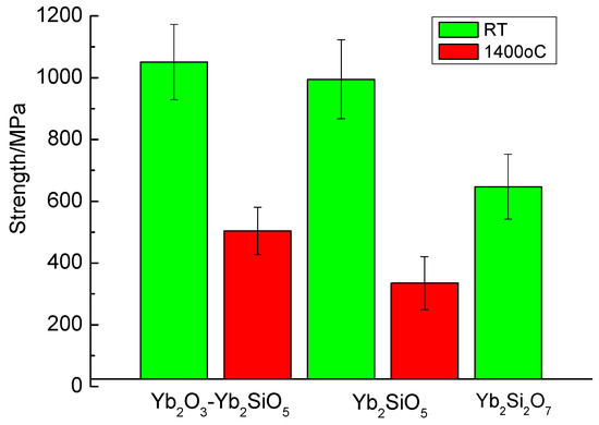 The comparison of strength characteristics of various fibers based on ytterbium silicates is presented in Figure 14. Going along the horizontal axis of the Yb2O3–SiO2 phase diagram from ytterbia toward silica, we observe the strength characteristics decreasing. An explanation of such a behavior of the materials crystallized from the melt should involve considering a number of factors, which are obviously beyond the scope the present work.