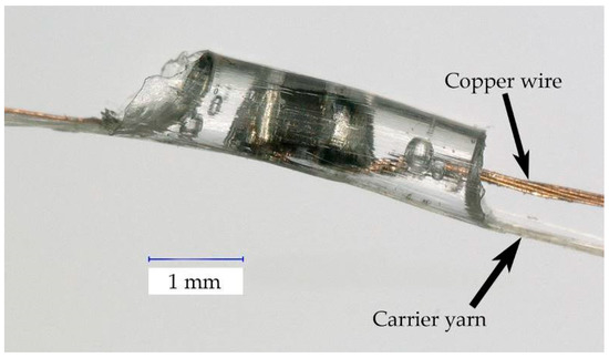 To enhance the mechanical properties of the completed E-yarn, the soldered semiconductor die was encapsulated along with a carrier yarn. The role of the carrier yarn was to support the soldered joint, protecting it and the copper wire from mechanical stresses during demolding and during subsequent E-yarn formation processes. 100 Dernier Vectran™ (Kururay, Tokyo, Japan) was chosen for its high tensile strength [21] combined with its flexibility. Figure 3 shows a soldered semiconductor die (a thermistor) and Vectran™ carrier yarn running alongside the copper wire; both included within a resin micro-pod that forms the encapsulation.