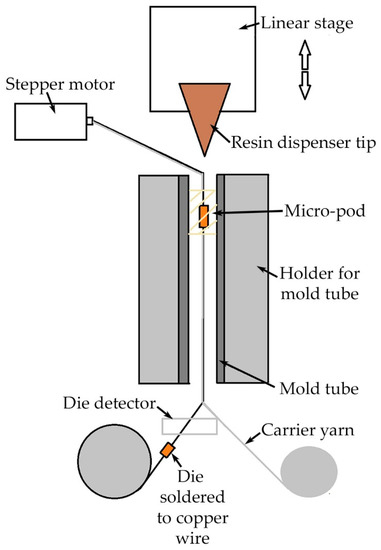 A method was developed to encapsulate package dies on flexible wire, with the process automated using the machinery shown in Figure 7. This shows copper wire and carrier yarn being fed through a sensor and into the bottom of the mold, in which the encapsulation is carried out. The system for injecting resin is directly above the mold, and the UV light guide points to the mold. It was found that a dispensed micro-dot of resin could flow into the tube that formed the mold, rather than being retained where the dispenser injected it. The requirement for resin to flow into the tube, but not fall straight through, also placed a maximum limitation on the diameter of the mold, which was required to hold the liquid resin inside until curing was complete. The chosen electronic components, such as package LEDs and thermistors, were small enough (1.0 × 0.5 × 0.5 mm) to be encapsulated within a 1.27 mm internal-diameter mold.