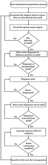 The automated encapsulation process was controlled and monitored by a LabView program, which controlled the sequence task as illustrated in the flow chart in Figure 6. The process consisted of the following steps: Following detection of the die, once the electronic component arrived at the encapsulation point in the mold, the stepper motor stopped and the linear stage moved the dispenser until the dispenser tip reached the encapsulation point where the soldered die was located. Resin was then dispensed. The linear stage was used to move the dispenser up again to avoid curing the resin within the dispenser’s tip. The LED UV light source was used to cure the dispensed resin in the mold. The process was then repeated to encapsulate the next die.