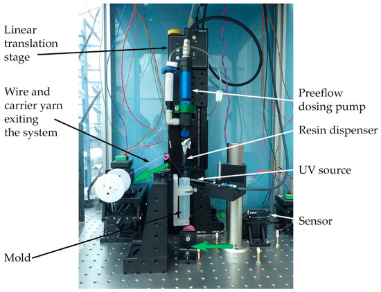 A photograph of the encapsulation system. The main components are labelled, and the large, green arrows show the direction of travel through the system of the copper wire with attached sensors.