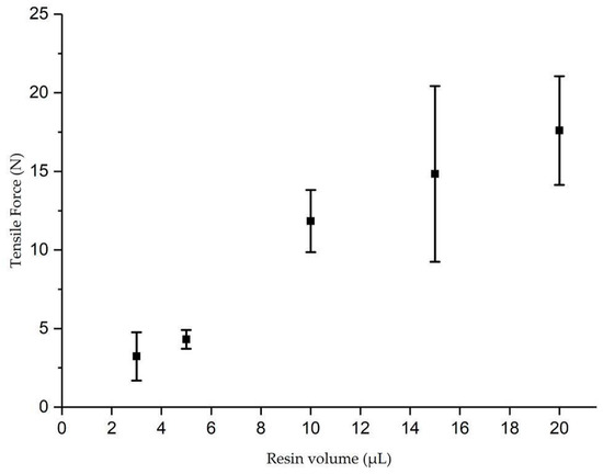 The force required to pull micro-pods from the PTFE mold was subsequently assessed using tensile testing. Figure 10 shows the force required to extract micro-pods from the mold after curing the resin inside a 1.27 mm PTFE tube. The increasing values of tensile force in Figure 10 shows that increasing volumes of resin, which led to increased micro-pod lengths (from 3.9 to 15.8 mm), and therefore contact area, required an increased force to be applied to remove the cured resin from the PTFE tube. The tensile force should not exceed the breaking force of the carrier yarn, which was known to be between 26.2 and 27.6 N [21]. The graph in Figure 10 shows that all micro-pods under investigation could be removed from the mold tube by exerting forces below these values, but further increases in the volume of resin or the diameter of the tube could lead to the force required to remove the micro-pod from the mold exceeding the carrier yarn strength. The results also indicated that the main force required to remove the micro-pod from the tube was a static force: The force required to initiate motion [30]. Little kinetic force [30] was required to maintain motion after this.
