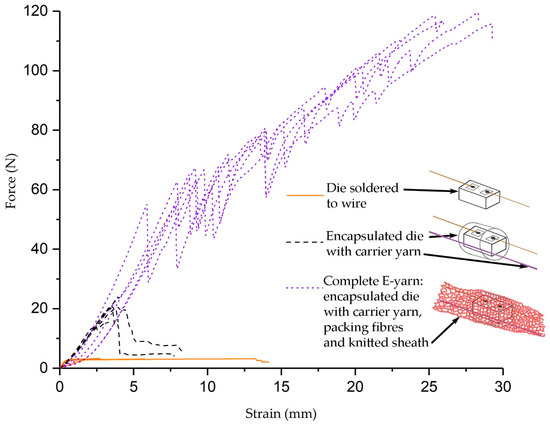 As a final validation of the influence of the encapsulation process, the tensile properties of the encapsulated yarn were compared with those of soldered, un-encapsulated components. Tensile tests were performed on five samples of un-encapsulated dies; five encapsulated dies; as well as five completed E-yarns containing encapsulated dies with carrier yarn, within knitted sleeves. The results are shown in Figure 11. The solid lines at the base of the graph show that un-encapsulated dies soldered onto wire had a low tensile strength with maxima between 2.72 and 3.21 N. Two of the five specimens broke after elongation of the copper wire rather than by fracture of the solder joints between the die and the wire. This is shown by the solid lines that extend along the x-axis of the graph, as the ductile copper extended before breaking. Encapsulating the dies within micro-pods increased the tensile strength to 15.01 to 23.94 N, as shown by the dashed lines on the graph. Encapsulation of the soldered joints, as well as carrier yarns included within the micro-pods, increased the tensile strength of these specimens. The completed E-yarn had a much greater tensile strength, as indicated by the dotted lines on the graph, showing initial breaking forces from 54.93–67.46 N. The use of both the carrier yarn and an outer, knitted sleeve greatly increased the breaking strength of the construction. The E-yarn sleeve was manufactured from eight individual polyester yarns plus packing yarns. The jagged pattern of breakage is likely due to fiber-fiber friction between the packing yarns within the construction. The knitting process brought these yarns together, creating a structure with greater tensile strength than that of the individual textile yarns that made up the construction. The single strands of copper and Vectran™ at the core of the E-yarn had a lower tensile strength. (Vectran™ yarn has been shown previously to have a tensile strength of 23–28 N [21].) The function of the micro-pod was not to provide additional tensile strength, but to protect the die and solder joints against impact and moisture ingress, so the outer sleeve was important in increasing the overall tensile strength.
