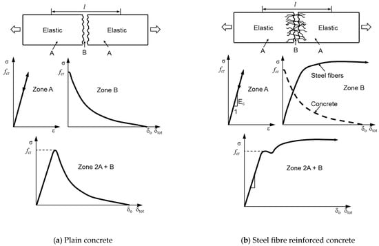 Typical fracture behaviour of plain concrete and SFRC under direct tension.