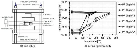 When the concrete is exposed to elevated temperature, its mechanical properties decade. For high-strength concrete, one of the major problems encountered in case of exposure to fire is that of explosive spalling. This is due to a combination of pore pressures and thermally induced stresses that cause the concrete to fail abruptly with a sudden release of energy [2]. This type of concrete failure is characterized by bursting and forcible separation of thin layers of concrete, accompanied by a typically loud explosive noise. The failure is progressive in nature, which may lead exposure of reinforcement or prestressing cables to direct fire. Furthermore, it reduces concrete cross section and can thus lead to partial or complete collapse of the structure [2]. The most efficient and popular method to mitigate explosive spalling is the addition of micro polypropylene (PP) fibres in concrete. According to experimental evidence, explosive spalling occurs typically at temperatures between 200 °C and 250 °C [20,21], while the PP fibres melt at approximately 160 °C to 170 °C. Empty or partially empty fibre beds together with the existing concrete capillary pores and micro-cracks form an interconnected porous network in concrete. The created network (e.g., increased permeability) provides free path for the water vapour to escape resulting in a relief of the pore pressure and hence no or very limited spalling occurs. Bošnjak [2] developed a test setup to measure the permeability of concrete at elevated temperatures and used it to measure the influence of micro PP fibres on the permeability of concrete. It was concluded that the addition of PP fibres does not significantly influence the transport properties of concrete up to 80 °C. However, between 80 °C and 130 °C concrete with PP fibres exhibits a sudden progressive increase in permeability of approximately two orders of magnitude (Figure 2). Beyond 130 °C the rate of increase in permeability reduces and it roughly corresponds to that of the concrete without fibres. Same as in the case of concrete without fibres, the residual permeability values of concrete with fibres are found to be somewhat higher than the permeability values at elevated temperatures.