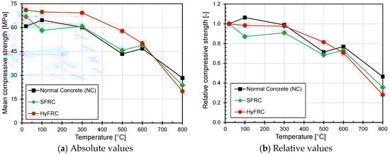 The compressive strength tests were performed on cubes with a maximum exposure temperature of 800 °C. The results of the mean compressive strength of different concrete mixtures obtained from the tests are plotted as a function of the exposure temperature in Figure 4a. In general, it can be observed that the inclusion of steel and micro PP fibres does not have any significant influence on the mean compressive strength of concrete. This can be attributed to the relatively low volumetric fraction of fibres in concrete. Nevertheless, it is found that the addition of micro PP fibres does not negatively influence the compressive strength of concrete, neither at ambient, nor at elevated temperature. It was further observed that the reduction in compressive strength for all the mixtures tested was rather strong for an exposure temperature of 800 °C. The scatter of test results within a particular test series was found to be rather low independent of the concrete type and exposure temperature, as visible in Table 3. The fibre-reinforced concrete types exhibit similar scatter as the normal concrete. With increasing temperature, the scatter increases slightly for all three concrete types. This is most probably related to the pronounced effect of concrete heterogeneity, which then affects thermally induced damage.