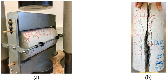 (a) Test setup and (b) typical failure mode of concrete cylinders used for determining split tensile strength after exposure to a temperature of 600 °C.