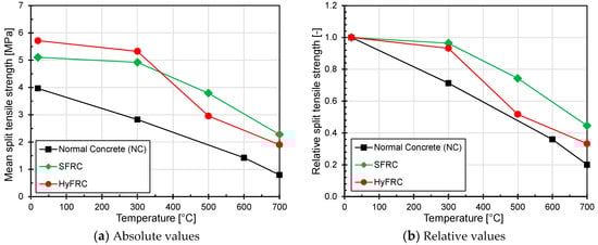 The mean value and the relative degradation of the split tensile strength obtained from the tests for different types of concrete is plotted as a function of the exposure temperature in Figure 7. As expected, the influence of the presence of steel and micro PP fibres on split tensile strength is significantly higher than that on the compressive strength of concrete. This is explainable by the fact that as the concrete cracks in tension, the fibres crossing the crack plane get activated and provide resistance to failure due to splitting. For the temperature range investigated (20 to 700 °C), the tensile strength of SFRC and HyFRC was around 40% to 150% higher than that of normal concrete. This shows a high beneficial influence of steel and micro PP fibres on tensile strength of concrete even at elevated temperatures.