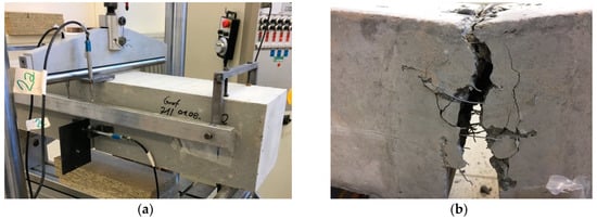 The flexural tensile strength or modulus of rupture of concrete was measured in accordance with RILEM 50-FMC Recommendation [25] using notched prismatic beam specimens with a cross-section of 150 mm × 150 mm and a span length of 600 mm. A notch of 5 mm width and 50 mm length was cut at the mid span of the beams. Figure 8 shows the test setup used in the flexural tests as well as the typical failure mode obtained for beams with SFRC. Note that the same test was used to evaluate the fracture energy of concrete as well. The tests were performed in crack tip opening displacement (CTOD) control.
