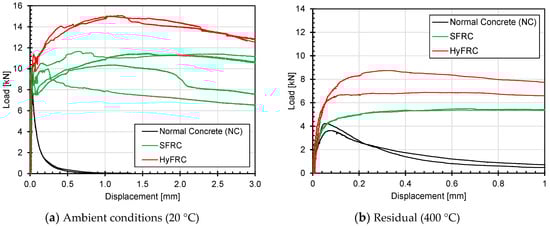 The typical load-displacement curves obtained from the flexural tests on notched beams are plotted in Figure 9 for different concretes (a) under ambient conditions and (b) after exposure to a temperature of 400 °C in residual conditions. The load-displacement curves for normal concrete displays a relatively straight pre-peak line, a well-defined peak and a gradual post-peak softening curve, typically associated with the tensile behaviour of normal concrete. The load-displacement curve for normal concrete retains its shape also after exposure to elevated temperature but reaching a lower ultimate load. However, the sharpness of the peak is reduced and the post-peak softening becomes more gradual for normal concrete loaded after exposure to elevated temperature.