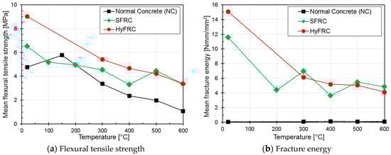 Figure 10a displays the influence of elevated temperature on the flexural tensile strength of different types of concrete. The concrete with both steel and micro PP fibres displays the highest strength values for almost all the exposure temperatures. The trend of the flexural tensile strength is comparable to that obtained for splitting tensile strength (Figure 7a). It may be noted that the slight increase in the flexural strength of NC after exposure to 150 °C is probably attributable to the increased concrete age at testing compared to all other specimens (concrete age 9 months).