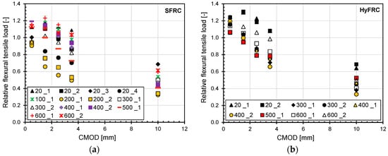 In order to obtain more insight into the ductility of fibre reinforced concrete after exposure to elevated temperatures, an evaluation of the residual flexural load for different CMOD values (first cracking, 0.5, 1.5, 2.5, 3.5 and 10.0 mm) was performed. The results are summarized in Figure 11. The relative flexural load represents the ratio of the flexural load corresponding to the measured CMOD and the load at the proportionality limit. According to the European standard EN 14651 [27] the proportionality limit is estimated as the maximum load attained before or upon reaching a CMOD of 0.05 mm. However, considering that this limit would not be realistic for thermally damaged concrete, the limit of proportionality was estimated as the maximum load attained up to a CMOD of 0.1 mm. In spite of the pronounced scatter, it can be observed in Figure 11 that the relative ductility of both fibre reinforced concrete types is not significantly influenced by the temperature.