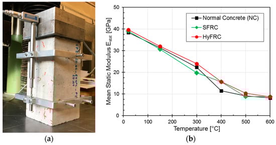 The static modulus of elasticity was obtained in accordance with EN 12390-13 [28] using the prismatic specimens of size 100 mm × 100 mm in cross-section and 200 mm in height. The typical test setup as well as the variation of the static modulus of elasticity as a function of temperature for different types of concrete investigated is plotted in Figure 12. Only fine cracks were observed o the surface due to thermal loading, which were marked. The plot of the static modulus of elasticity as a function of temperature clearly shows that the absolute values as well as the variation of the elasticity modulus the temperature for SFRC and HyFRC are quite similar to that of normal concrete. Considering the relatively low volumetric content of the fibres in concrete, it can be expected that the fibres do not have any significant effect on the modulus of elasticity.