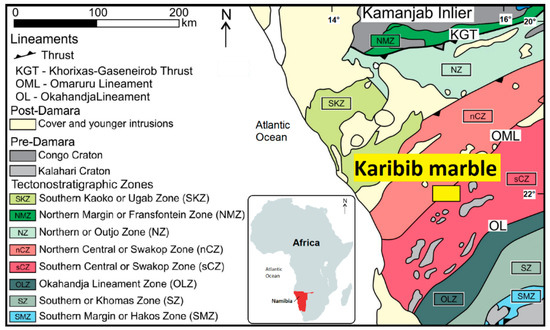 In the last century, Namibia has been one of the favorable mining contexts for the exploration and evaluation of geo-resources. From 1990 to 2000, in Namibia, the production of marble and granite was about 20,000 tons per year. Since 2004, thanks to modern methods and processing machinery, there has been a continuous increase in production, and the production has exceeded the threshold of 50,000 tons/year [1]. The geo-mining industry of Namibia includes several ornamental stones: marbles (calcite and/or dolomite-bearing metacarbonate rocks); magmatic rocks such as granites, granodiorites, and gabbros; serpentinites; and onyxes and alabasters. The firms linked to the ornamental stone that are gathered around the Karibib have become a benchmark for the high quantity and quality of marble.
