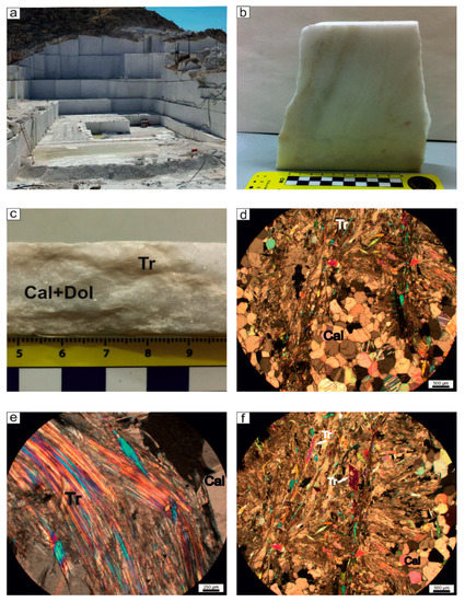 The main features of Karibib white marbles. (a) Front of a quarry where marble is exploited as dimensional stone; (b) Appearance of the marble at the mesoscopic scale, note the yellow-greenish veins across the pearly portion; (c) Particular of a cross section of a brick; (d–f): Photomicrographs of thin sections of marbles; (d) Coexistence of granoblastic portions constituted by calcite with nematoblastic portions constituted by tremolite; (e) Blow-up of acicular tremolite-rich level; (f) Nematoblastic level showing various habitus types of tremolite, from prismatic to acicular. Mineral symbols after [50].