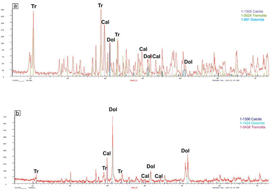 X-ray diffractograms on representative portions of the Karibib white marbles, showing calcite, tremolite, and dolomite as constituting mineral phases. The peak color of each mineral is indicated in the legend. (a) main vein; (b) massive part.