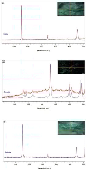 Micro-Raman spectra of selected areas of the Karibib white marbles, showing (a) calcite; (b) tremolite; and (c) dolomite as constituting mineral phases (red spectra). The blue reference spectra are after [52]. Pictures of boxes indicate the investigated points.
