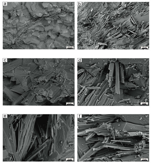 Scanning electron photomicrographs. (a) Calcite-rich granoblastic levels cut by tremolite veins; (b) Elongated tremolite crystals, sometimes showing radial disposition; (c) Tremolite splitting into fibers; (d) Tremolite cleavage fragments prone to split; (e,f) tremolite fibers whose shape parameters may resemble asbestiform habitus. Mineral symbols after [50].