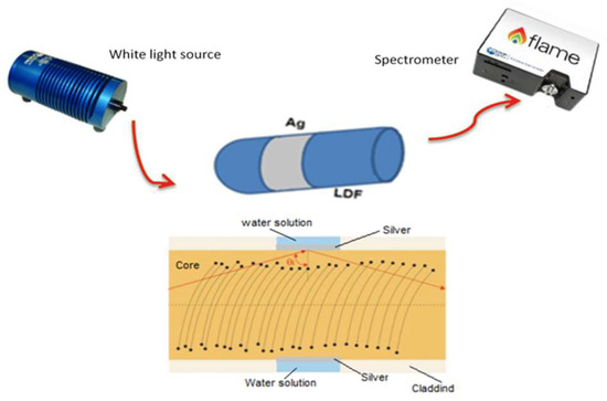 Silver metal presented good adhesion to the core, as proved by its resistance to rinsing in de-ionized water. Figure 2 shows that the SPR-LDF sensor system comprises a tungsten halogen light source (HL2000, Ocean Optics, Dunedin, FL, USA), and a spectrometer with a detection range from 350 to 1000 nm (FLAME-S-VIS-NIR-ES, Ocean Optics, Dunedin, FL, USA). The light emitted by the tungsten lamp is coupled to the light diffusing fiber, while the transmitted light is analyzed through the spectrometer. The transmission spectrum of the fabricated sensor has been recorded while varying the surrounding refractive index (SRI) using water-glycerol mixtures at different concentrations. An Abbe refractometer (model RMI by Exacta Optech, Germany) with a precision of 0.001 was used to measure the RI of each prepared mixture.