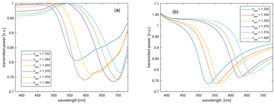 Figure 3a,b show the experimental and numerical transmission spectra of the prepared sample. Each spectrum was obtained through normalization to the reference spectrum, acquired with air as the surrounding medium. As expected, both numerical and experimental spectra exhibit shorter SPR resonance wavelengths, compared to those achieved with the gold-coated sensor [15]. In particular, the SPR wavelength measured at is ≈ 570 nm, against an SPR wavelength of ≈630 nm measured with the gold-coated sample. In addition, a fine agreement between experimental and numerical spectra, in terms of minimum transmittance, is observed. In fact, except for the measurement in water (), in all other cases, the minimum transmittance is around 75%, in good agreement with simulations.