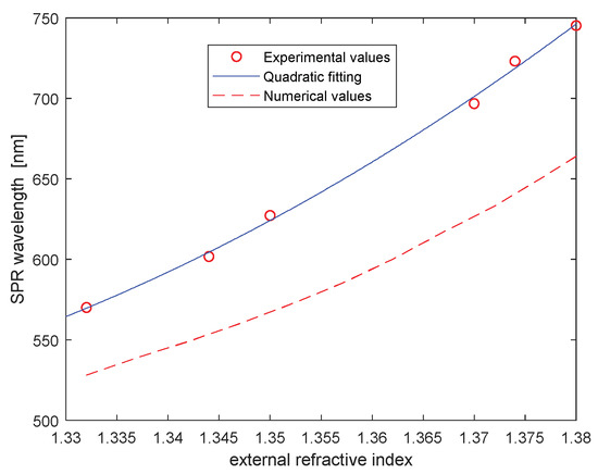 As regards sensitivity, the quadratic fitting curve permits us to extrapolate a sensitivity ranging from 2600 nm/RIU (at ) to 4700 nm/RIU (at ).