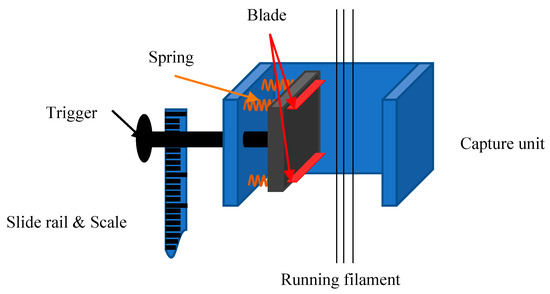 To study the evolution of the morphology and structure of polymer blend fibers, it is necessary to detect the second phase inside the fiber matrix, which is not easy due to the limitation of on-line measurement methods. Thus, a high-speed camera was used to record the flow of biphasic fluid and monitor the morphology evolution in a transparent tube [30]. However, optical recognition of the second phase in a polymeric matrix is not possible when the matrix is not transparent, which is common in most fiber materials. Furthermore, this technique is quite limited to the concentration of the second phase and the reflection index between polymer components. Therefore, in most research, the evaluation of the morphology development of polymer blend fibers is executed by collecting samples from the original position (usually by quenching extrudate in a low-temperature bath, and once removed, the capillary die) and take-up position. Recently, our group [31] and Tran et al. [32] both used a self-made fiber capturing device (see Figure 1), which allowed the capture of the running filament at different spinning line positions and quenched the structure of the filament at a low temperature. This was done in order to study the morphology development of blend fibers at a high resolution.