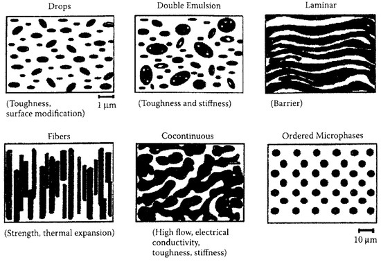Schematic of morphologies which can produced by polymer–polymer melt blending [33]. Reused with permission from W. Macosko Christopher, Macromolecular Symposia; published by John Wiley and Sons, 2000.