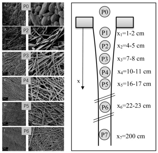SEM images of poly (lactic acid) (PLA) domains at different spinning line positions according to the schematic view of the filament capturing diagram, which was shown on the right side of Figure 3: P0 (A and B), P2 (A and B), P3 (C and D), P4 (E and F), P5 (G and H), P6 (I and J) [32]. Reproduced with permission from Tran, N.H.A.; Brünig, H.; Boldt, R.; Heinrich, G., Polymer; published by Elsevier, 2014.