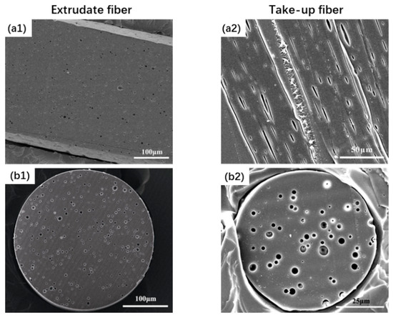 SEM micrographs of polypropylene (PP)/polystyrene (PS) extrudate fiber and blend fiber taken at 500 m/min from (a1 and a2) a longitudinal section and (b1 and b2) a cross section after removing the dispersed PS phased in solvent. The dark spots on the cross section represent PS phases. The weight percent of PS phase in blend fiber is 8%; the zero-shear viscosity ratio of PS/PP is 10.8 [31]. Reproduced with permission from He, H.; Chen, L.; Zhang, Y.; Hong, S.; Zhou, Y.; Zhu, M., Fibers and Polymers; published by Springer Nature, 2014.