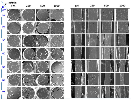 The equilibrium between the break-up and coalescence of droplets makes the morphology and its development along the spinning line more complicated, especially in high concentrations and particle–particle interaction systems [9,58,59,60]. Tran and co-authors [32] showed that the dispersed phase tends to coalesce with the adjacent dispersed phase in order to form continuous long micro- or nanofibrils. When they investigated the morphological evolution of thermoplastic PVA/PLA blend filaments along the spinning line, a random morphology of the dispersed PLA phase was observed in the earlier stage, when the equilibrium between the break-up and coalescence of droplets was in a delicate balance status, which may be due to the not fully developed morphology in the extrusion capillary. Furthermore, this irregularly dispersed PLA was also stretched into micro- or nanofibrils. Yang’s study [40] showed that the fibrils or droplets at the surface of polymer blend fibers can coalesce into a continuous layer or network during melt spinning when the drawdown ratio (DDR) is high enough.