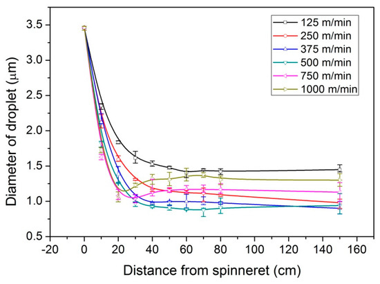 Number-average diameter of droplet versus distance from spinneret. Error bars show the maximum and minimum of the number-average diameter, and open symbols show the average diameter of the analyzed SEM micrographs of samples captured at each spinning line position. Symbols are connected with B-Spline solid lines [31]. Reproduced with permission from He, H.; Chen, L.; Zhang, Y.; Hong, S.; Zhou, Y.; Zhu, M., Fibers and Polymers; published by Springer Nature, 2014.