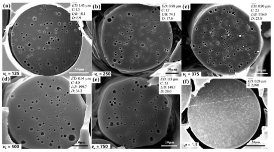 SEM micrographs of PP/PS take-up fibers at various velocities; (a) 125, (b) 250, (c) 375, (d) 500, and (e) 750. The zero-shear viscosity ratio of PS/PP is 10.8 for all samples from (a)–(e). (f) SEM micrographs of the extrudate fiber with a viscosity ratio of 1.5. The weight percent of the PS phase in blend fiber is 8% for all cases [64]. Reproduced with permission from He, H.; Chen, L.; Sun, S.; Wang, T.; Zhang, Y.; Zhu, M., Fibers and Polymers; published by Springer Nature, 2014.