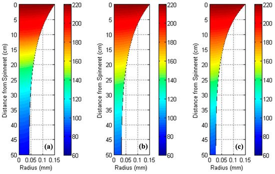 2-D distributions of the temperature (°C) of PP/PS blend fibers at various take-up velocities: (a) 125, (b) 250, (c) 375 m/min [53]. Reproduced with permission from Chen, L.; He, H.; Zhang, Y.; Chen, Y.; Zhu, M., Fibers and Polymers; published by Springer Nature, 2015.