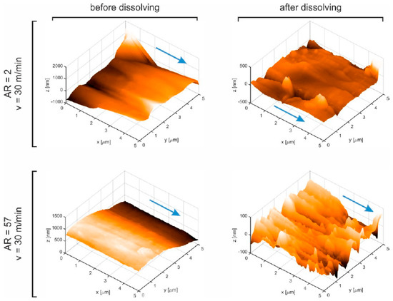 Atom force microscopy images of the surface patterns of PP/PS gradient fibers after hot-drawing, before (left column) and after (right column) dissolving PS. The upper and lower rows show the surfaces of the fibers processed with v = 30 m/min and aspect ratio of capillary AR = 2 and 57, respectively. The weight percent of PS is 20% and the viscosity ratio of PS/PP is 2.45. Arrows indicate the fiber axis [6]. Reused with permission from Pan, D.; Hufenus, R.; Qin, Z.; Chen, L.; Gooneie, A., Macromolecular Materials and Engineering; published by John Wiley and Sons, 2018.