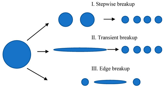 There are three types of break-up that can be found in experimental studies: stepwise, transient, and edge break-up mechanisms as shown in Figure 11 [71,72]. Stepwise break-up usually happens in the case of low , wherein the mother droplet break-up converts into two same droplets when . The deformation and break-up of droplets can be predicted when the reduced capillary number (see Equation (7)) based on Huneault’s criteria [73] is taken into account. According to Huneault’s certificate, droplets cannot deform in the case of . Droplets deform but not break-up in the case of ; droplets deform and then split into two primary droplets for ; and droplets deform into fibrils and disintegration when .