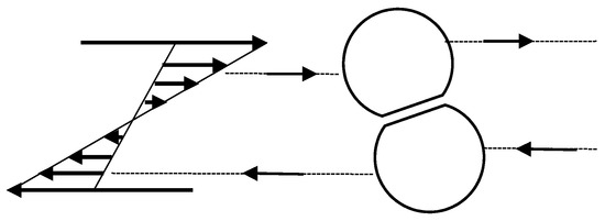 The flow-induced coalescence of droplets is a complex phenomenon and is mostly studied in shear flow, where droplets with different coordinates in the direction of the velocity gradient collide [9], as shown in Figure 12. The course of coalescence usually has three steps: (1) the approach and collision of droplets; (2) the rupture of the matrix film between two approaching droplets; (3) the drainage of the matrix film. It is difficult to find further research on the coalescence of droplets in elongational flow. However, the current coalescence theory of droplets is limited to a low shear rate range and low concentration blends. Many problems have not yet been studied, and most theories focus on the coalescence between sphere droplets, which is not common in the elongational flow. Most research neglects the effect of other droplets on the collision droplet pairs [9].
