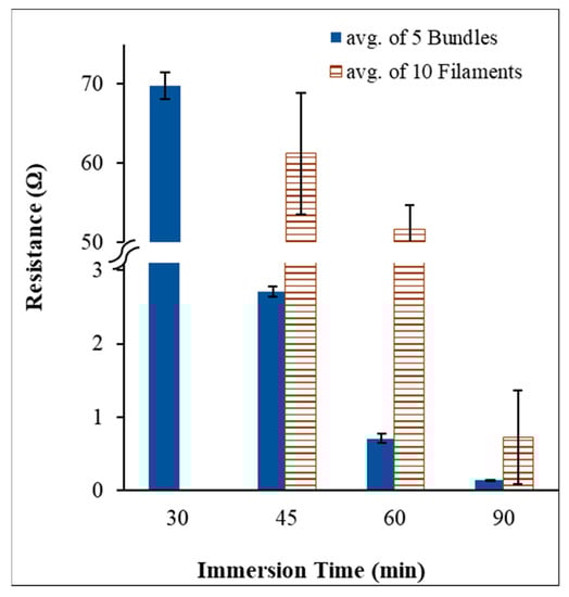 Measurement of the electrical resistance on bundles rather than on individual fibers is more practical and relevant to the application of fibers in composites, since the final product (textiles and composites) would be made of bundles rather than single filaments. This is also evident from the graphs in Figure 2, since the resistance of the bundles compared to single filaments was always lower for the same immersion time. According to the experiments, the immersion time of 15 min only led to measured resistance in the MΩ ranges, thus the bundles practically remained non-conductive. In such cases, samples have always resulted in matt surfaces as shown in Figure S3. However, the conductivity continued to increase by increasing the immersion time. This supports the claim of having new contact points from the larger surface area of the deposited copper, which is likely to penetrate deeper into the bundle.