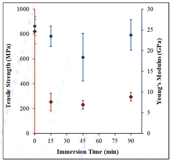 Due to the limited amount of sample, and seeking a proof of concept, the mechanical properties were investigated on individual fibers rather than on bundles. Figure 3 shows the mechanical properties of the UCF and coated fibers for different Cu-plating times. The tensile properties of the fibers have been largely degraded. Stiffness and strength of the single fibers for the 15 min immersion time decreased by around 10% and 70% respectively when compared with UCF. It is possible that exposing the fibers to chemicals in the plating process causes relaxation of the molecules leading to a loss of orientation and disorder in the fiber microstructure [12]. The orientation of the cellulose chains is responsible for its mechanical performance and is attained during the manufacturing process by stretching the fibers along the axial direction. It is reasonable then, to consider that if these chains are allowed to relax by any external factor, they tend to form a more amorphous structure and lose their orientation, leading to reduced mechanical performance. Copper, on the other hand, is a rigid metal compared to the soft fibers (the stiffness of copper is estimated around 128 GPa [13]) and its presence on the surface of the fibers is responsible for increasing their stiffness and compensate for the stiffness lost during the chemical treatment. However, due to its brittleness it does not contribute to the strength. This was further investigated by FTIR analysis. However, no significant difference is noticed in the strength of the samples at different immersion times, indicating that the degradation occurred either during the fiber-surface-activation process or immediately after immersion in the copper-plating bath. To confirm this statement, additional investigation should be carried out. After 90 min immersion time, the fibers seem to retain some of their properties, since the stiffness loss was only 8%. As mentioned above, this is possibly due to the support provided by the large amount of copper deposited on the fibers.