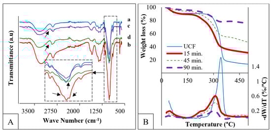 (A) Fourier-transform infrared (FTIR) analysis: a, b, c, d spectra correspond to uncoated and coated fibers for 15 min, 45 min, and 90 min respectively; (B) Thermo-gravimetric analysis (TGA) analysis (top) and derivative of thermo-gravimetric curves (bottom).