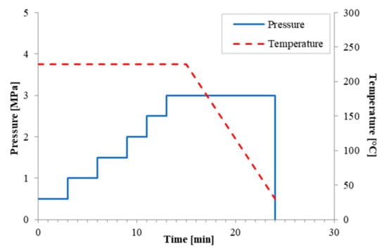 Composite laminates were obtained by the film stacking technique according to which PA11 films and hybrid fiber fabrics were alternately stacked and hot-pressed with a lab press Mod. P400E (Collin GmbH, Ebersberg, Germany) under pre-optimized conditions with a maximum temperature of 225 °C. The molding cycle is shown in Figure 1.
