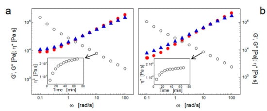 Frequency dependence of G’ (red circles), G’’ (blue triangles), and η * (empty circles) for PA11 TL (a) and PA11 P40 TL (b) at θ ≈ 10 °C. The time evolution of G’ (red circles) and G’’ (blue triangles) at ω = 10 rad/s is shown in the insets.