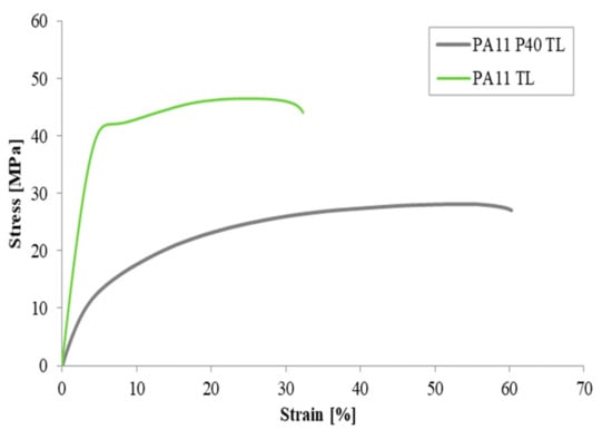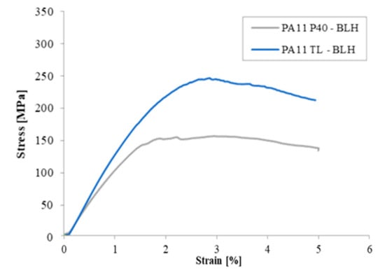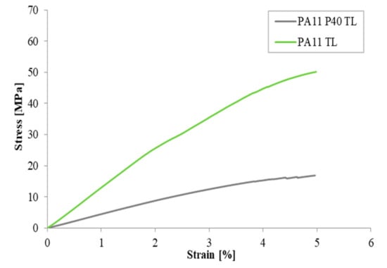 Similarly, Figure 4 refers to the flexural response of PA11 TL and PA11 P40 TL. In this case, both resins show that the stress, at least on the deformation range foreseen by the reference standard (up to 5%), is continuously increasing. This behavior can be explained on the basis of the ductility of the studied materials and, therefore, of their ability to support the load without yielding until 5% of deformation is reached.