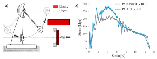 First of all, the results indicate that all specimens did not break during the high-speed flexural test. This further proves the high toughness of the investigated samples, which bend without breaking eventually slipping away. An estimate of the maximum deformation experienced by the samples can be computed through simple geometrical considerations, which lead to a limit deflection of about 39 mm. When properly converted with Equation (2), this value corresponds to about 12% of percentage strain. From a qualitative point of view, the two samples share the same behavior: the stress sharply increases until a maximum at about 4% of strain, and then it gradually decreases. No consideration can be made about the comparison between the rigidity of investigated composite systems, given the usual noise of this kind of curves. However, the performance of the composite based on PA11 P40 TL is only slightly lower than those of the sample based on the PA11 TL in spite of the big differences in terms of the flexural properties of the two matrices.