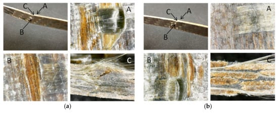 Optical micrographs showing the composite samples based on the not plasticizes PA11 TL (a) and plasticized PA11 P40 (b) after the Charpy-like tests. For both figures, the sub figures A, B and C represent the top view, the bottom view and the side view, respectively.