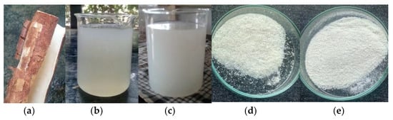 - Leite, A.L.M.P.; Zanon, C.D.; Menegalli, F.C. Isolation and characterization of cellulose nanofibers from cassava root bagasse and peelings. Carbohydr. Polym. 2017, 157, 962–970. [Google Scholar] [CrossRef]