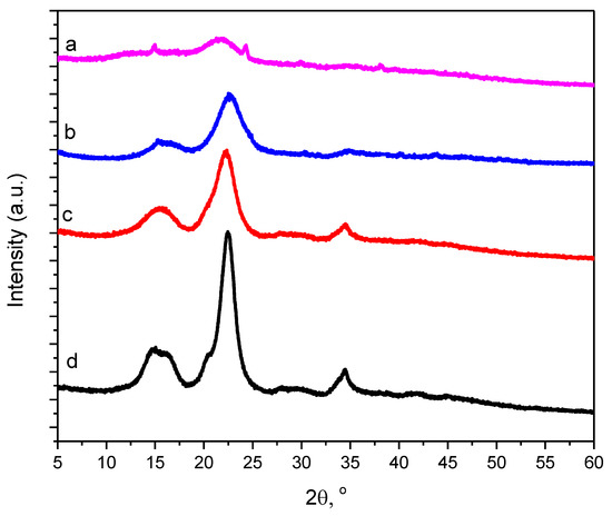 XRD of (a) untreated CP, (b) CNF procedure I, (c) CNF procedure II, and (d) MCC.
