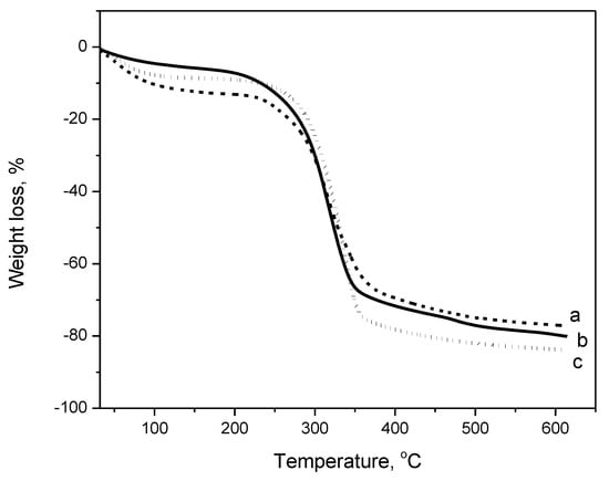 Thermogravimetric (TG) curve of (a) raw CP, (b) CNF procedure I, and (c) CNF procedure II.